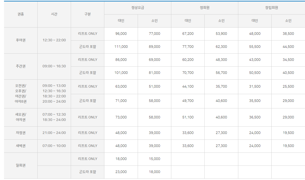 - 레이더스 : 국내 최고 경사도 (상단평균 경사도 70%) 만선베이스 최상단에 위치한 슬로프로 상단에 오르면 직벽으로 느껴지는 코스입니다. 이곳은 반드시 보험에 가입하고 오를 것을 권하는 곳입니다.