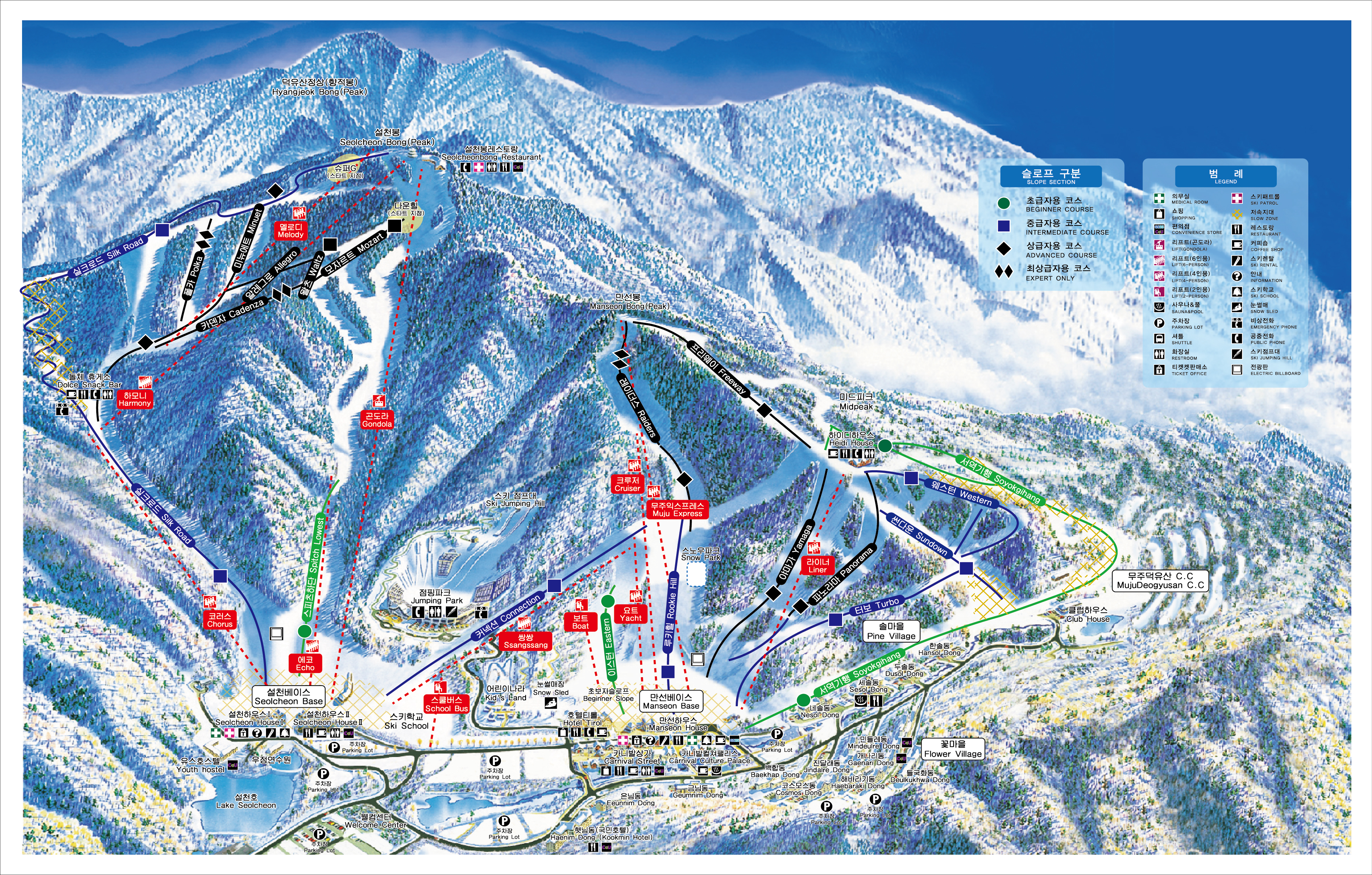 - 커넥션 : 만선베이스와 설천베이스를 이어주는 역할을 담당하는 코스로 중급수준의 스키어가 이용하기에 알맞습니다.