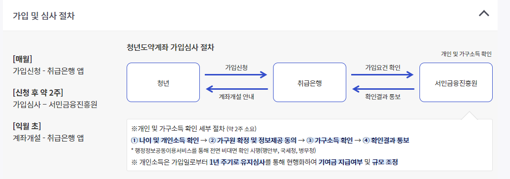 매월 초 청년도약계좌 취급은행 앱을 통해 비대면 신청 및 가입