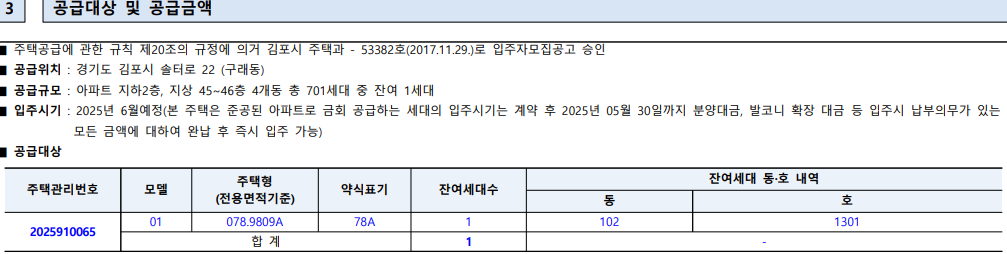 공급규모 : 아파트 지하 2층, 지상 45-46층, 4개동 총 701세대 중 잔여 1세대