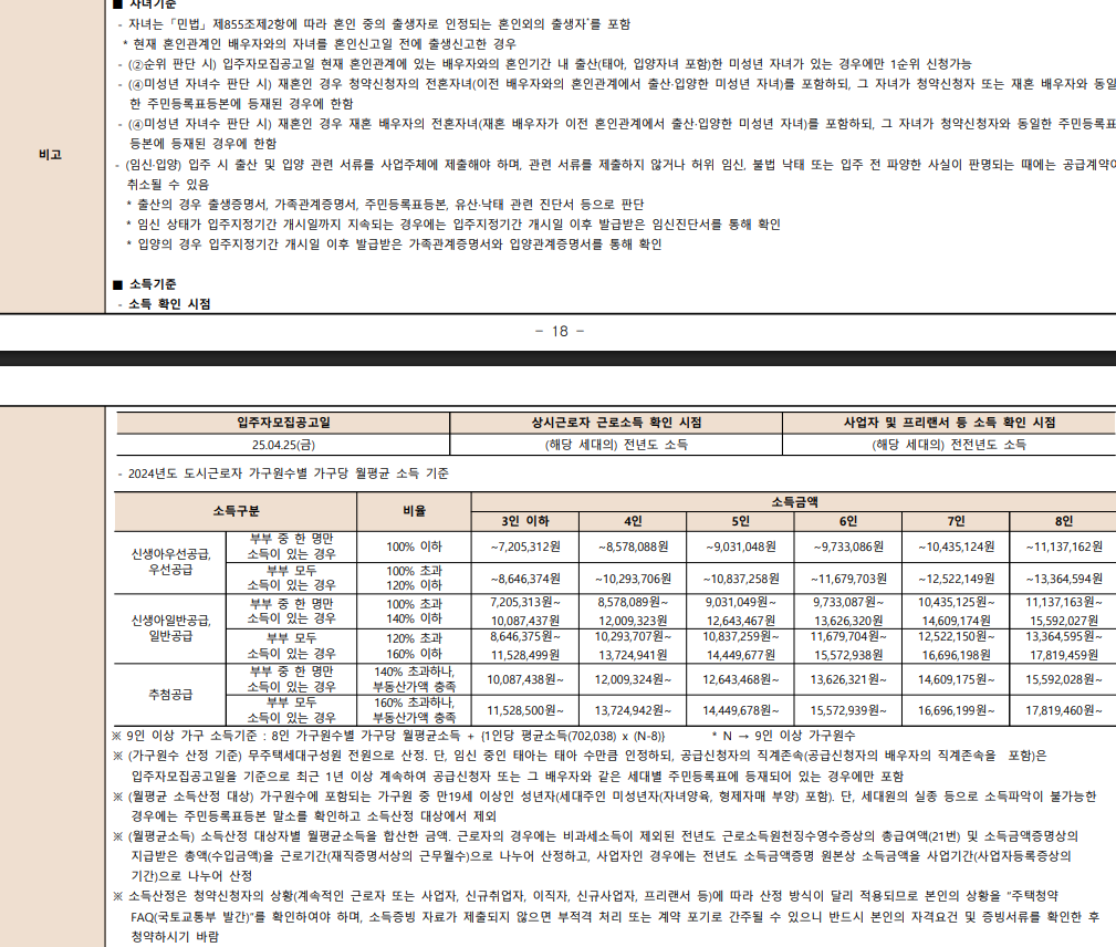 1) 소득 기준 세부 구분 (신생아 특별공급 적용)