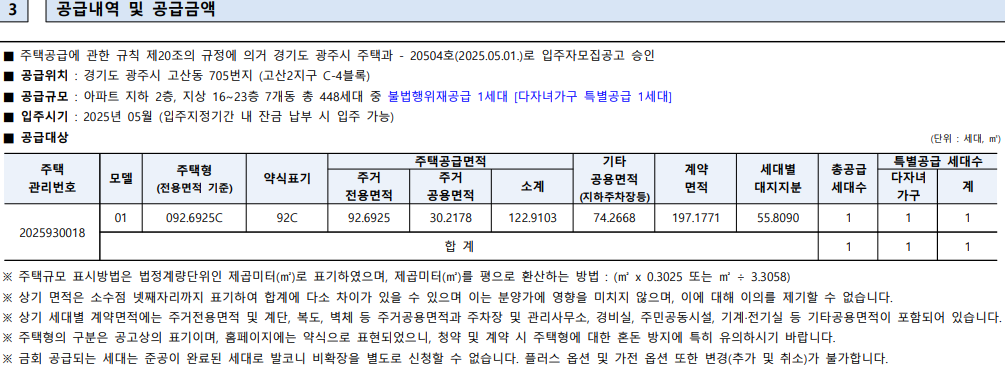공급규모 세부 : 계약취소주택(다자녀가구 특별공급) 1세대