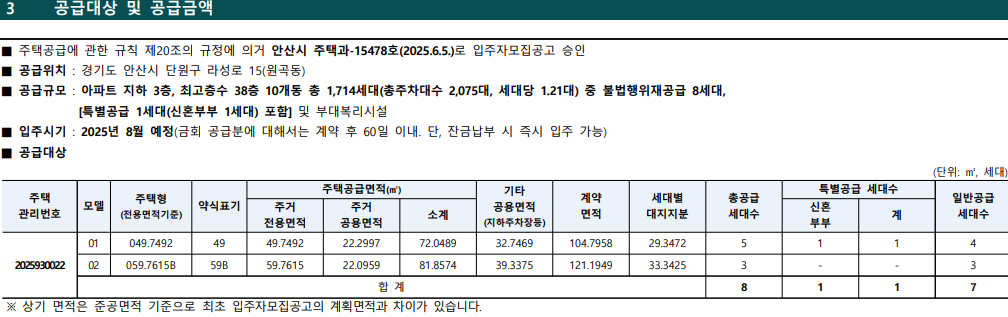 공급규모 세부 : 특별공급 1세대(신혼부부), 일반공급 7세대