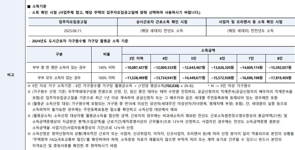 2024년 신혼부부 특별공급 도시근로자 가구원수별 가구당 월평균 소득 기준 및